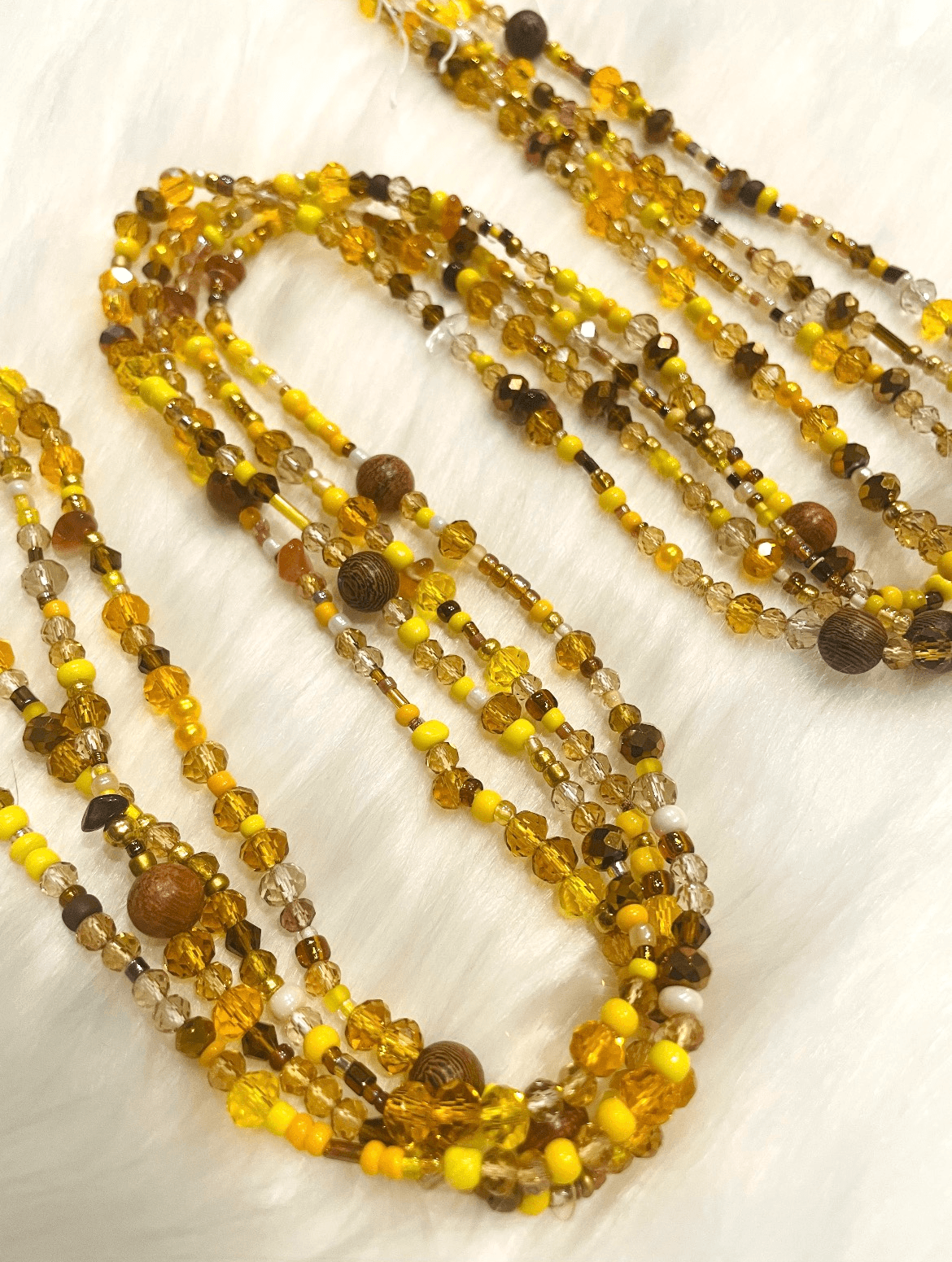 Inspired by the golden tones of autumn, Fallen Harvest captures the beauty of changing seasons and the warmth of natureโ€™s glow. This handcrafted waist bead set blends soft honey beads, warm amber crystals, and translucent neutrals that shimmer like fallen leaves kissed by sunlight.
