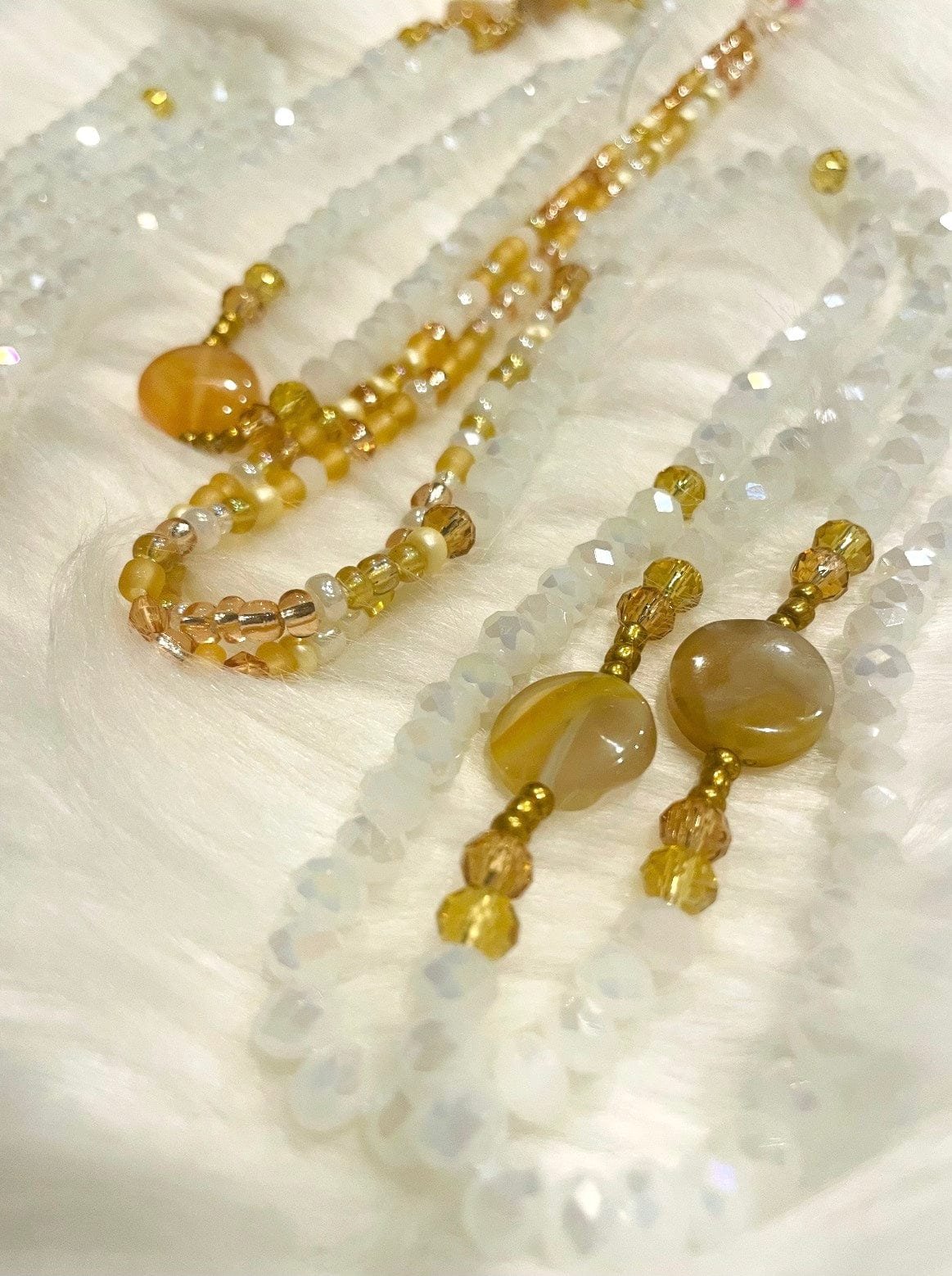 Each strand includes a smooth honey-gold centerpiece bead, symbolizing clarity, cleansing, and renewal. The combination of milky white beads and golden tones reflects purity, light, and inner strength — making Golden Purity perfect for intention-setting, body adornment, or everyday beauty.