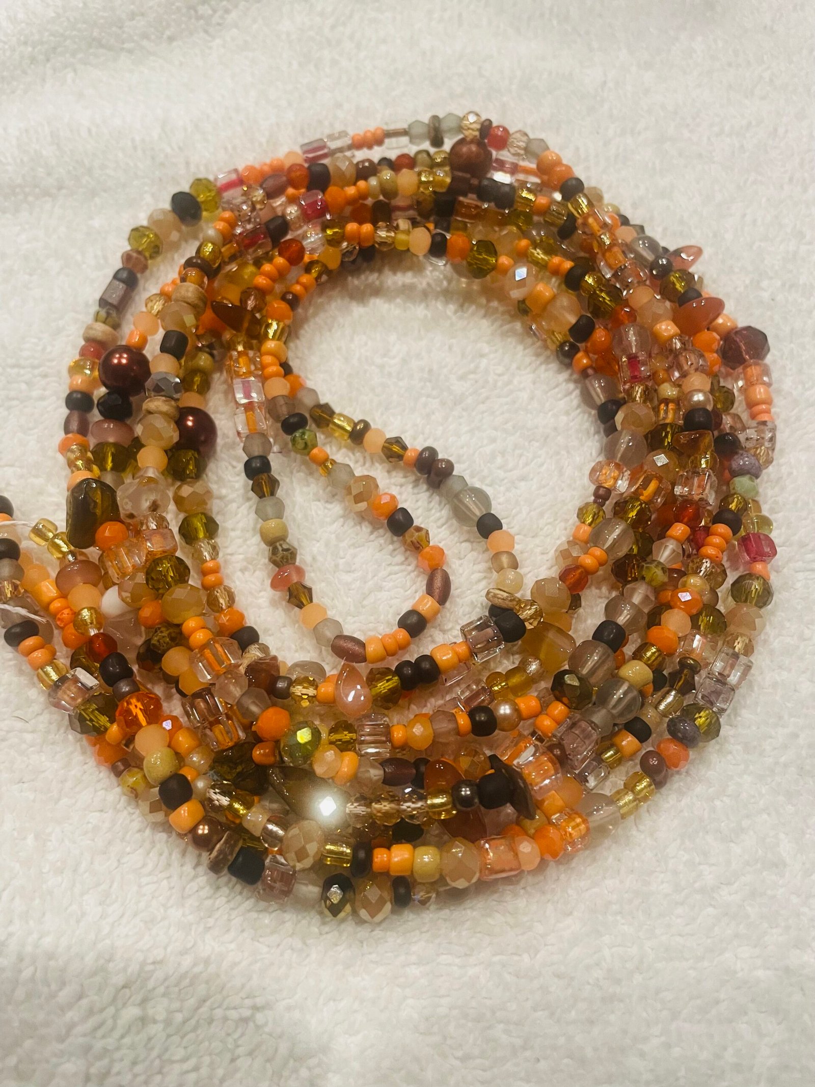 Inspired by the rich colors of autumn and the beauty of a plentiful harvest, Harvest Luck waist beads feature a warm blend of amber, burnt orange, golden, and earthy tones. Each strand sparkles with natural warmth, symbolizing abundance, prosperity, and gratitude.