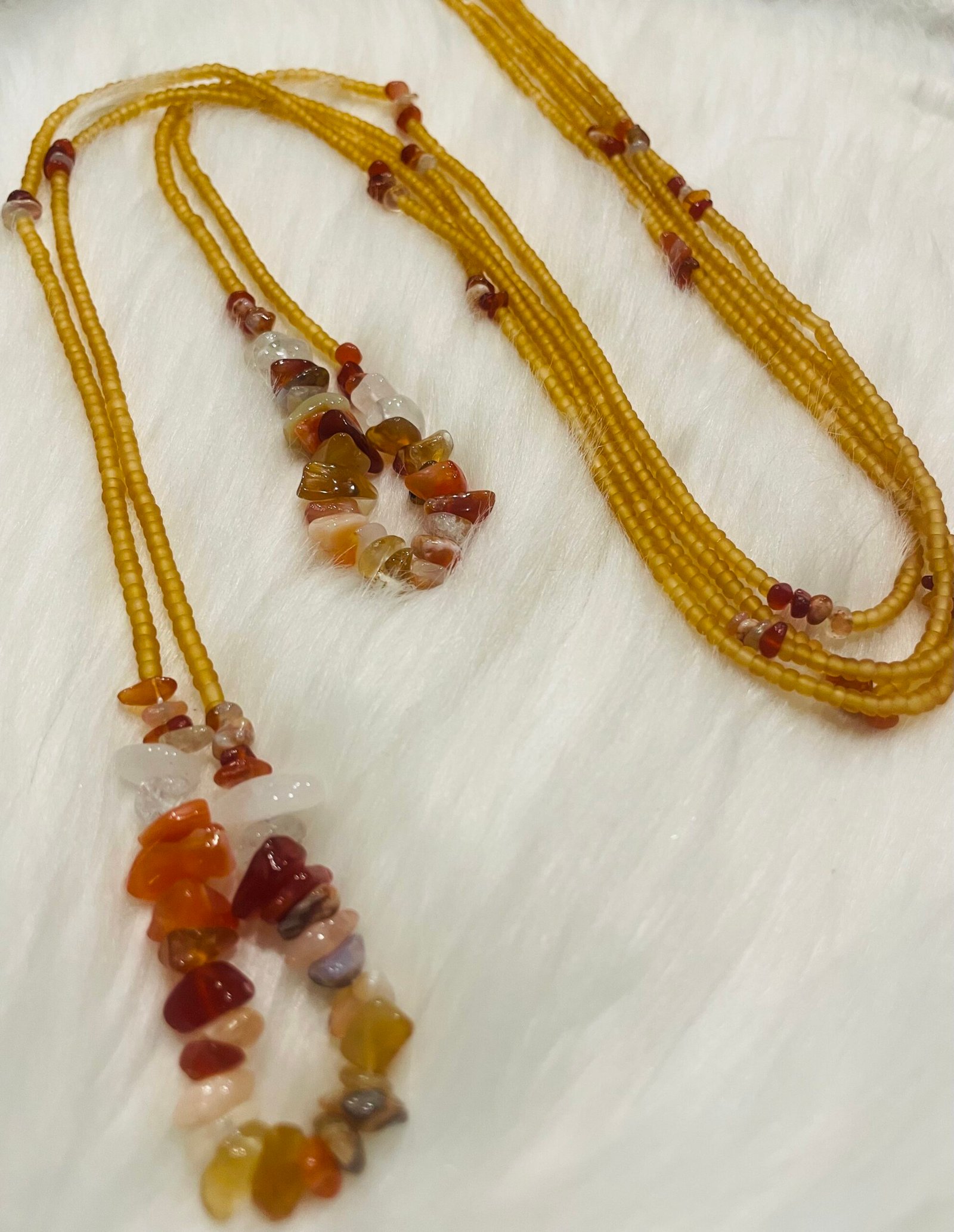 Meet Aziza — a radiant expression of strength, passion, and divine feminine energy. This piece features warm golden seed beads paired with natural carnelian and clear quartz chip stones, creating a glowing, earthy elegance that feels both grounding and empowering.