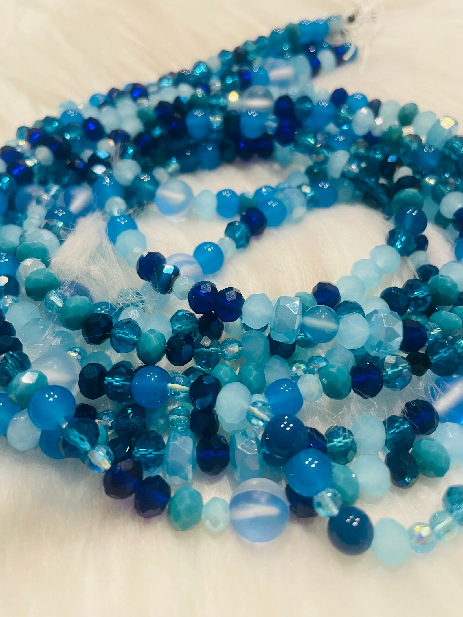 Peaceful, calming, and beautifully radiant—Blue Haven waist beads are inspired by the soothing colors of tranquil waters and clear skies. Featuring a stunning mix of deep navy, aqua, and soft sky-blue beads, each strand sparkles with cool elegance and serene energy.