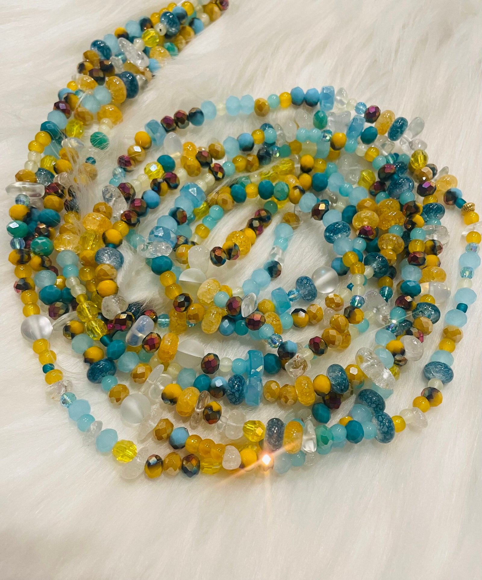Bright, refreshing, and full of life—Sunshine Blue waist beads capture the beauty of golden sunlight meeting crystal blue waters. Featuring a radiant blend of vibrant yellows, soft aqua blues, and shimmering clear accents, each strand sparkles with playful energy and warmth.
